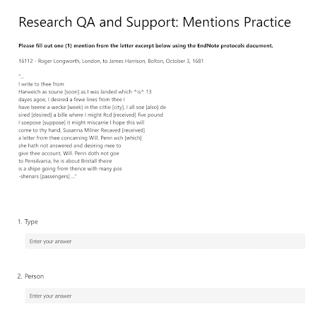 As you can see there is more mentions to pull from this letter. It will be interesting to see what the researchers will notice, as they are only allowed to document one mention. I will be saving each answers from the forms and reviewing them with the researchers the following week. I also will be developing metrics as I progress in my internship. These Microsoft Forms will be important in finding agreements and disagreements among researchers. Since we have a diverse group who annotate differently, it will be important in creating a comprehensive protocols for everyone to follow.